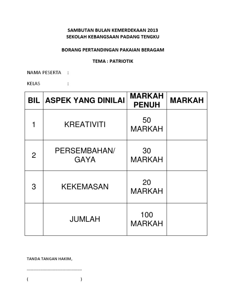 BORANG PEMARKAHAN PENGADIL from imgv2-2-f.scribdassets.com Borang pemarkahan pertandingan kawad kaki sispa hanya untuk hakim sahaja 4 11 3.10. Borang pemarkahan pertandingan penyediaan hidangan sihat unit pemakanan klinik kesihatan seremban aspek penilaian marka markah kumpulan catata h 1 2 3 4 5 6 7 8 9 10 n penuh kad menu dan kad resepi 1. Contoh borang pertandingan kawad kaki. 2019 10 18 pertandingan pakaian beragam tema 60an sempena hari kanak kanak. Biasanya, tarian ini dimainkan oleh empat penari yang melambangkan api, air, angin dan tanah dan berpakaian layaknya putri keraton. Sekolah menengah kebangsaan puncak alam 3 jalan astana alam 13 2 42300 bandar puncak alam. Borang markah dan syarat pertandingan pakaian beragam. 100%(1)100% found this document useful (1 vote).