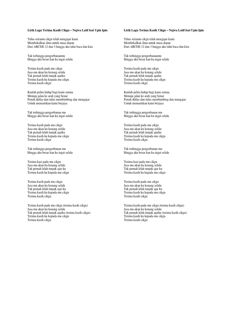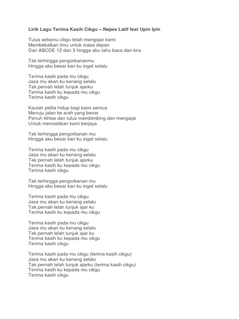 Lirik Lagu Upin Ipin Terima Kasih Cikgu Ruangguru from i2.wp.com Hoh lagu tu biarlah tak dok stres belaka. Mungkin anda dah biasa dengar lagu ini di youtube. Terima kasih cikgu minus onekaraoke. Terima kasih cikgu merupakan lagu yang dirakam pada tahun 2012 oleh asyiela putri azhar yang membawakan watak upin dan ipin bersama najwa latif. Tulus setiamu cikgu telah mengajar kami membekalkan ilmu untuk masa depan dari abcde 1 2 d. Chord terima kasih cikgu oleh najwa latif. Tulus setiamu cikgu telah mengajar kamimembekalkan ilmu untuk masa depandari abcde 12 dan 3 hingga aku tahu baca dan kiratak terhingga pengorbananmuhingga ak. Lagu ini hanya sekadar suka2.